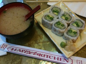 Hello out there…I did it! I made the move today! I am back in NYC after two years back home in Arkansas. Holla! It was all bittersweet, as always, with a million emotions and thoughts flooding my last several days in Jonesboro. Pros and Cons constantly coming to me, but when I arrived, all was well with the world and I somehow felt comforted being surrounded by strangers who all look different than me and hearing so many different languages being spoken around me. I explored my neighborhood where I will be for the month of October, Jackson Heights, Queens. It’s really cute-tons of stores and markets and restaurants. I already have my eye on some new hot pink rain boots (my current ones are 3yrs+ old & are beginning to split) and I bought a carton of strawberries on the street for $1. Shain and I ate at a tiny place called Happy Kitchen that served healthy Japanese dishes and sushi. I will return! Tonight I had a vegetable roll filled with cucumber, asparagus, and avocado and a miso soup.