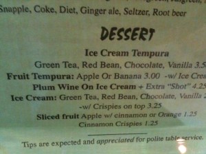 I have not tried it (yet) but on the dessert menu: Plum Wine on Ice Cream. Yes, please! Also, one of my personal favorites: Green Tea Fried Ice Cream. YUM.