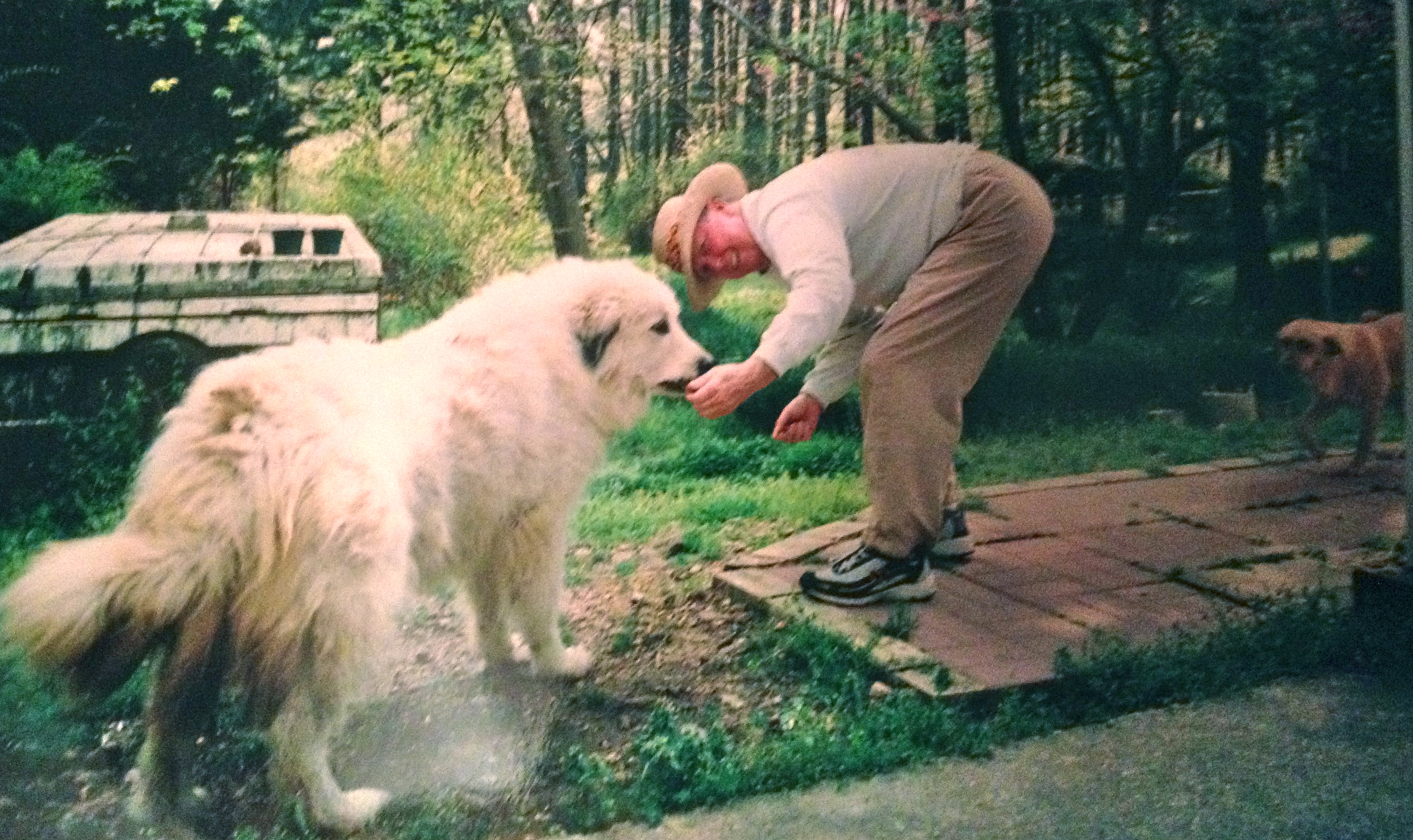 So as I said, we knew Ginger was getting along in years, her brother Spike has passed on years before dying of heart worms. (Let me interject here, that we live in the country–outside city limits. Although things have changed now, a lot of people used to just have dogs. They lived outside and were fed table scraps and allowed to run free. They really only saw the vet to get fixed or if they were in dire need. This is pretty much how I grew up and it really wasn’t a bad thing. They were not neglected, they just weren’t treated like members of the family like most dogs are now! Now, our dogs still live outside and are allowed to roam free on our property, but they visit the vet and wear collars and eat dog food. I feel guilty though, because we long ago should have made proper fencing around our house and some of the property. It could have kept our animals safe and I am sad that is it only a priority after this event.) A few years prior to her death, my parents inherited Casey, the Great Pyrenees. She came to live with them after becoming too smart for her own good at her current farm home of one my dad’s employees. She learned how to escape from the electric fence and begin to tell all her sheep friends how to do it as well! She was about three years old when they got her and she lived in the backyard in the dog pen where all our dogs start out, (until she got brave enough to simply jump the fence.) She was very aloof. All I wanted to do was hug that big white fur ball and she would have none of it. It took me years to get her to come to me while I squatted down, held out a treat, and turned my head away. She would quickly take it and then run off, of course. We had never had a dog like that, but we loved her just the same, and she loved us too… just from a little ways away. She had a special relationship with my dad, who could give her a pat on the head. And if you ever walked the property, she would go with you–a few yard behin.