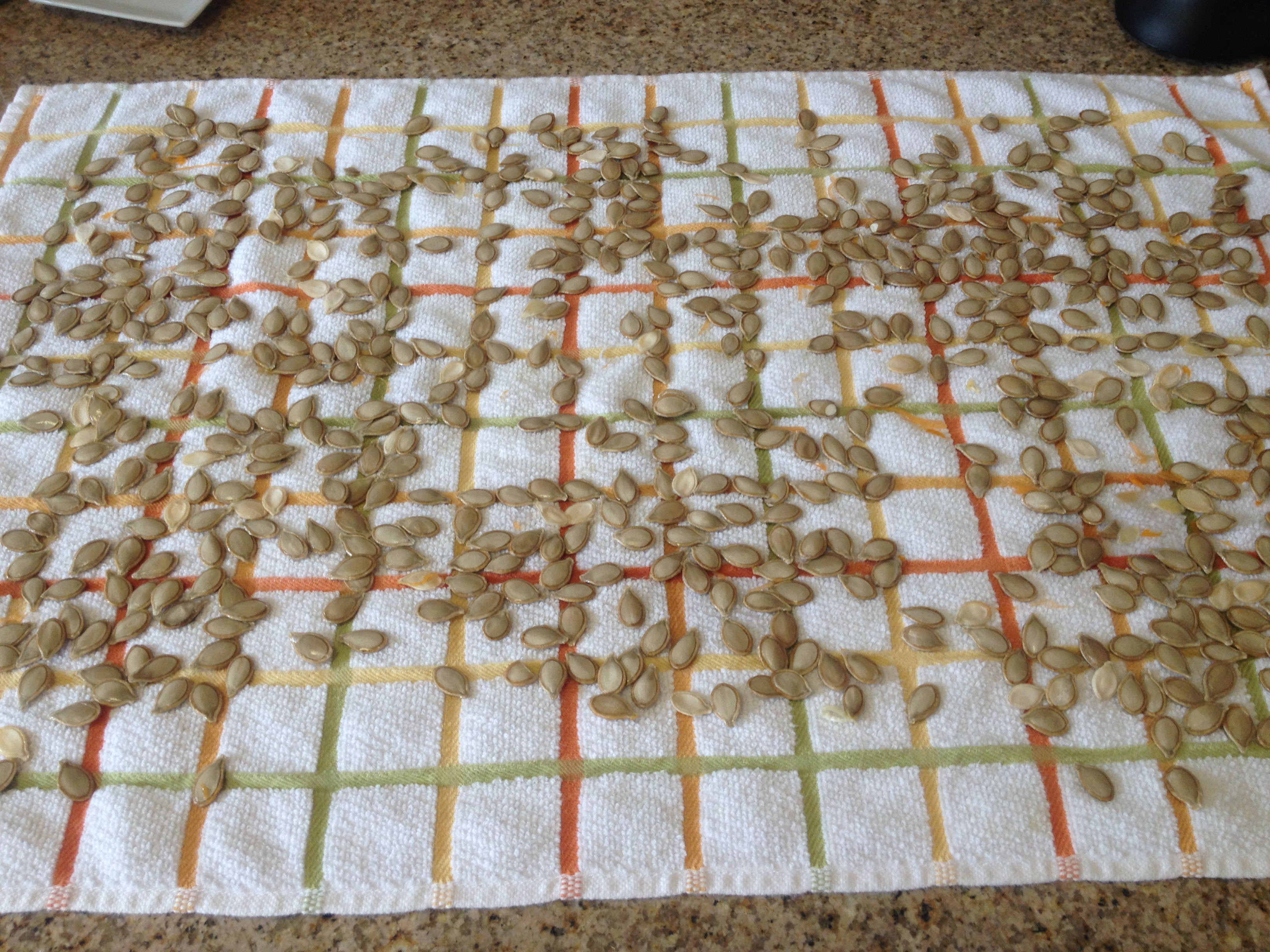 Next, cut it in half and scoop out the seeds and stringy insides. I don’t like to waste any seeds from pumpkins or other squashes, so rinse the seeds in a colander and get rid of all the slimy stuff. Then lie the seeds out on a drying towel–in a single layer–and let them completely dry out for several hours or overnight.
