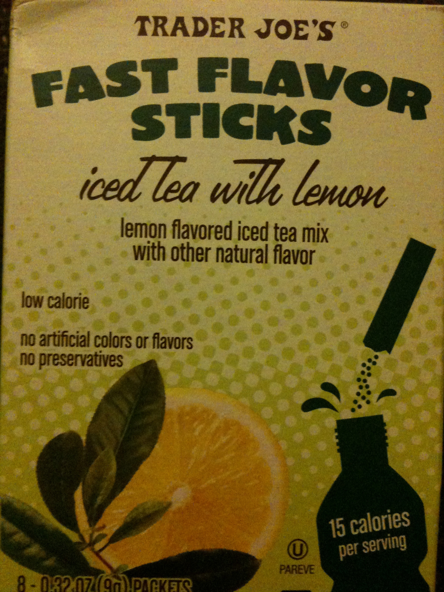 Trader Joe’s. Well that’s the first thing–just having access to Trader Joe’s is wonderful. Then TJ’s Fast Flavor sticks you add to your water–delicious and NOT sweetened with aspartame but stevia. It’s healthier crystal light.